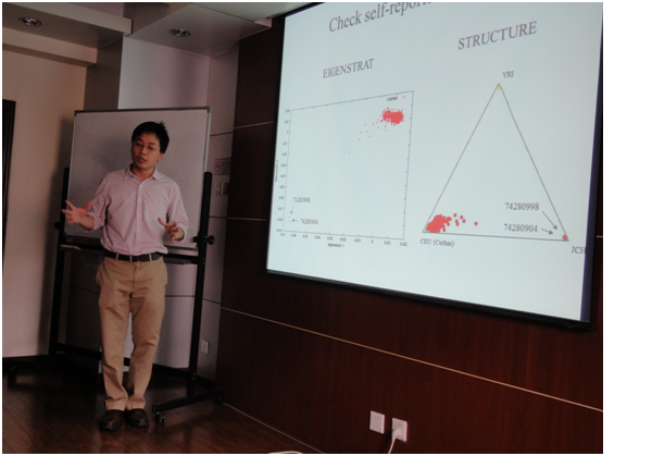 梁黎明教授的报告主要侧重于组学相关研究数据分析方法的讲解和介绍。他以全基因组关联分析研究的定义及其发展历史、典型研究设计、数据质量控制及主要结果解读展开,让与会者对组学研究设计有一个直观、全面的认识。同时还强调了GWAS研究中基因借补对数据的充分利用及统计效能的增加起到的重要作用。随后,梁教授就二代测序技术、外显子测序或外显子芯片技术、基因环境交互作用、甲基化数据分析方法、样本统计效能估计、代谢组学数据分析方法等进行了简要的概括。最后,梁教授介绍了两种可用于在组学研究中的统计学研究方法:孟德尔随机化(Madelia Randomization, MR)及Mediation Analysis模型建立等。报告后大家进行提问与交流。