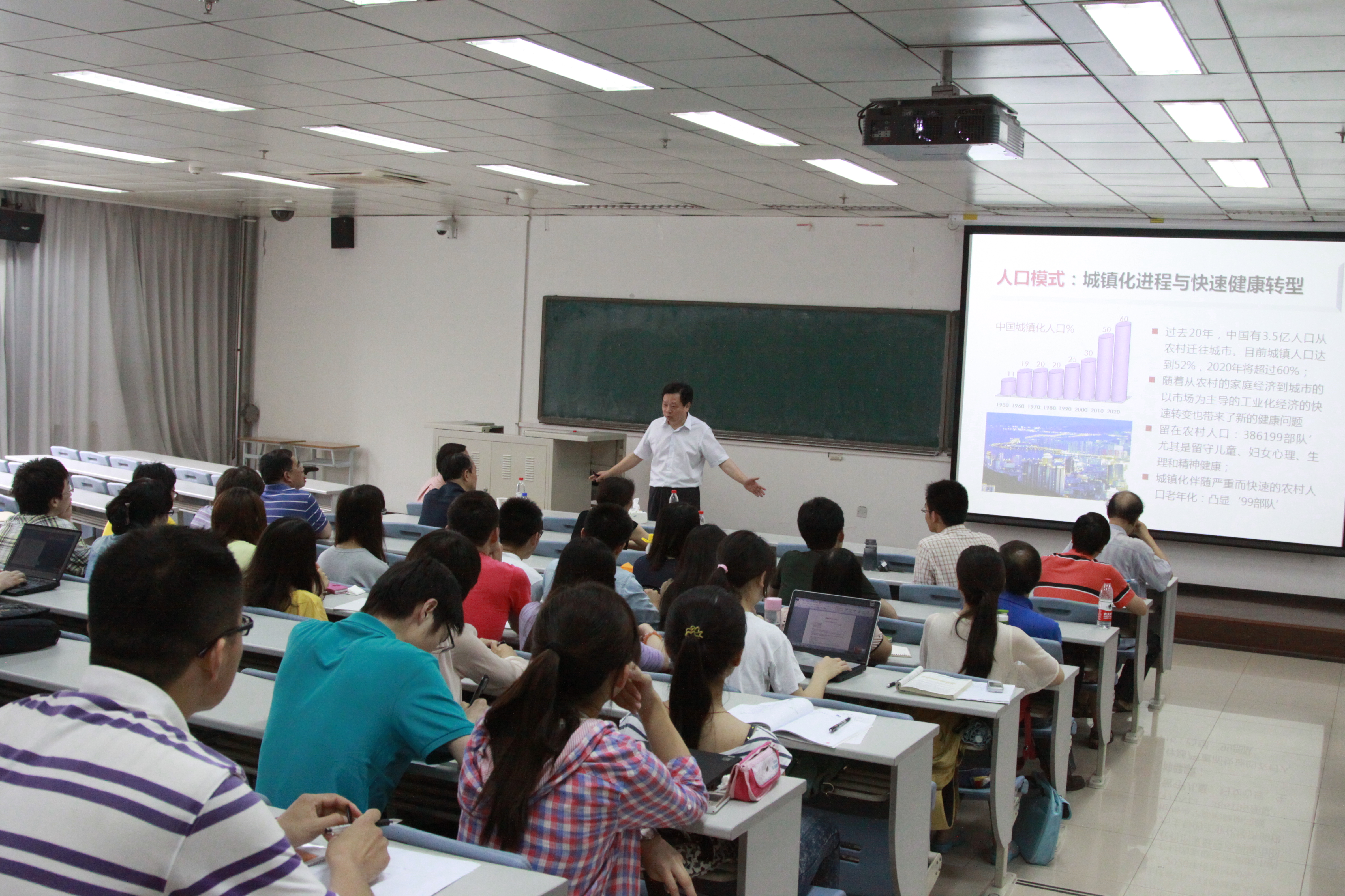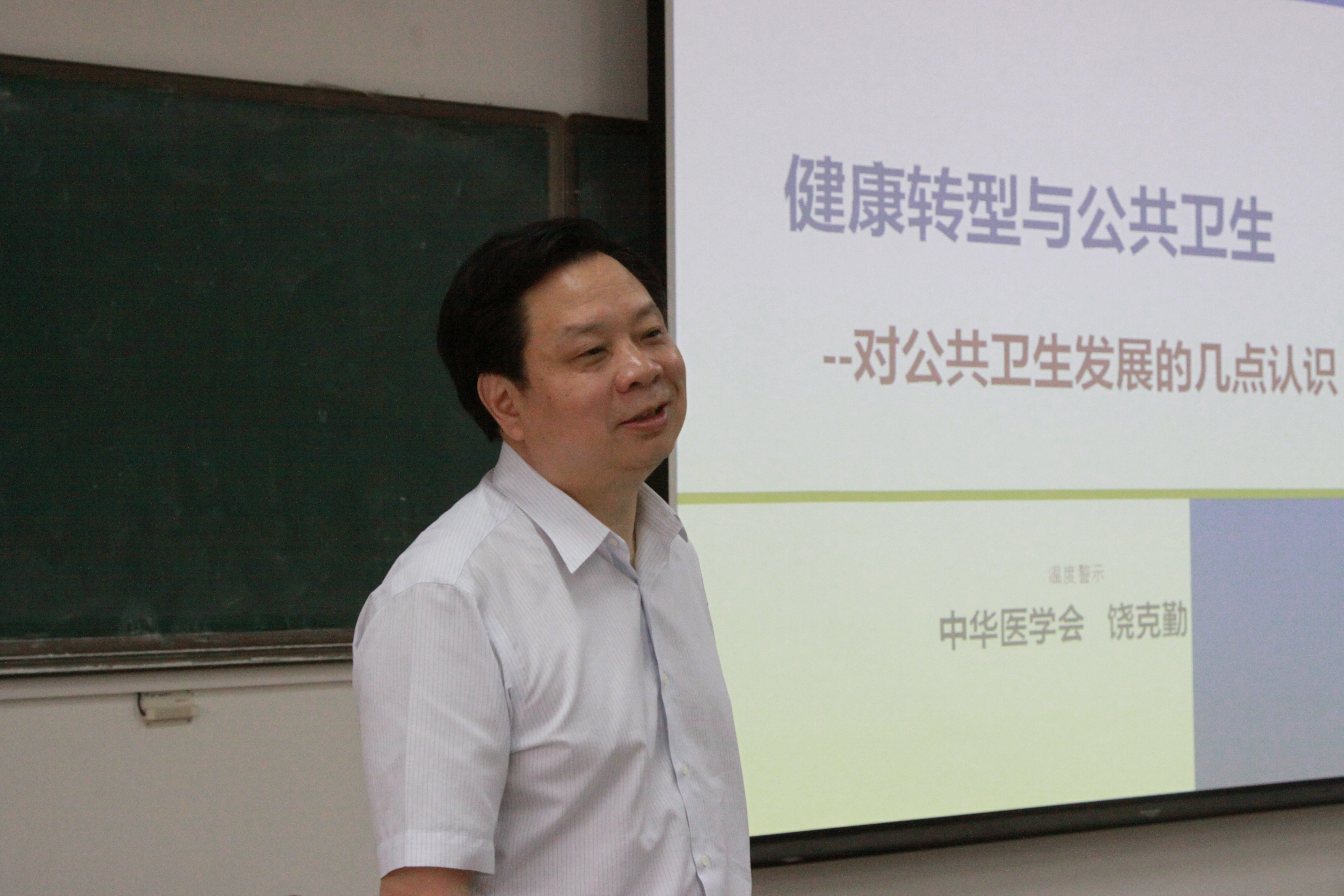 饶克勤教授以“健康转型与公共卫生”为主题,围绕“经济转型与健康转型”、“人口模式与疾病模式”、“慢性疾病与危险因素”、“疾病负担与经济损失”、“干预技术与干预政策”、“健康转型与医学发展”五个方面的内容分享他对公共卫生工作的思考,他从健康转型的现实出发,探究慢性疾病“井喷现象”的成因及危险因素控制工作的关键,并以生动的案例为员工示范有效的健康宣教,提出“公共卫生问题既靠干预技术更靠干预政策”,引导师生思考我国公共卫生发展的方向与路径选择。