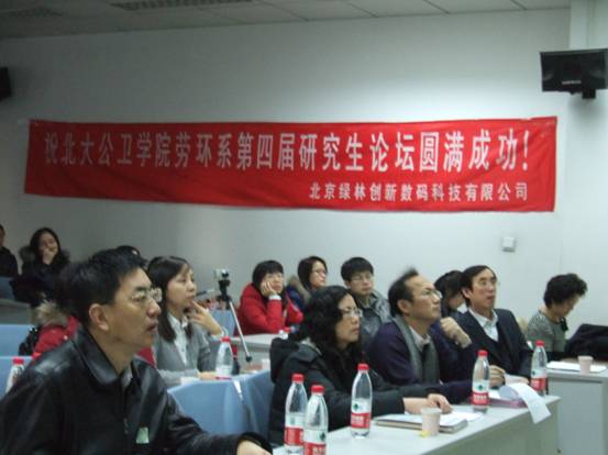 本次论坛由丽娜和卓滋泽两位同学主持,由劳环系主任郭新彪教授和潘小川、赵艳红、贾光、马文军、崔蓉、何丽华等几位校内外的教授担任本次论坛的评委。本次报告的题目有:《Time-Series Analysis on the relationship between ambient PM10 and daily emergency room visits of cardiovascular disease in Beijing》、《Oxidative stress in rats intratracheally instilled with PM10》、 《Genetic Effects of Hexavalent Chromium in Chinese Chromium Chemical Production Workers》、《北京市H区日平均气温与呼吸系统疾病死亡的病例交叉研究》等,这些研究报告充分体现出劳环系的科研工作在各位导师和研究生的共同努力下,近年来获得了丰硕的科研成果。大家用热烈的掌声感谢报告人的精彩演讲以及专家评委和同学们提出的建设性问题。最终,苏畅凭借在《Time-Series Analysis on the relationship between ambient PM10 and daily emergency room visits of cardiovascular disease in Beijing》报告中以流利的英文口语、清晰的研究思路以及良好的讲台形象摘得第一名的桂冠,并获大奖(320G移动硬盘一个);刘晓华和卢秀玲得到二等奖;其他报告人也都有上佳表现,并分别获得奖品。奖品的资金均由北京绿林创新数码科技有限公司特别赞助。
