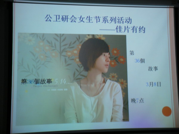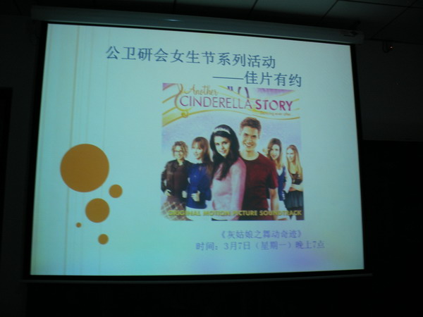 在3月7、8日的晚上,公卫研究生会在逸夫楼专门为全校的女生们播放了两场精彩的浪漫电影《灰姑娘之舞动奇迹》和《第36个故事》,来观看电影的同学络绎不绝。第一部电影华丽四射,炫丽的舞蹈、美丽照人的女主角和帅气逼人的王子把大家带进了一个现代版灰姑娘的故事------身边有天使般的好朋友、绚丽的南瓜汽车、帅气的歌星男朋友,让现实中普通的我们似乎成了女主角回到了那个会幻想的时代;第二部电影清新淡雅,给我们阐释出了一种新的生活方式和态度。现代女性钟情于都市生活、环球旅行、咖啡馆、爱情等,却又不失理想与自由,一个个关于故事的故事,给大家又带来了不一样的感受。