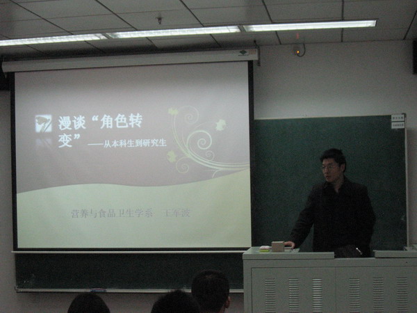王军波老师的讲座紧紧围绕“如何完成角色转变”这个主线展开,他首先用诙谐幽默的几个短语概括了本科生与研究生的区别,然后王老师分别从学习、科研、生活这三个维度对新同学提出了一些建议,最后对所有的新同学提出了殷切的希望:希望大家踏踏实实做学问,勤勤恳恳搞科研,希望所有的新同学都能够化茧成蝶,拥有一个光辉灿烂的美好前程。纵观王老师的整个讲座,不是呆板的说教,而是充满了形象生动的比喻和喜闻乐见的小故事,这一点从讲座现场的阵阵笑声很容易看出。