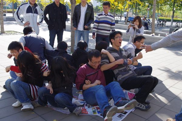 观赏完了中国这伟大的建筑,我们开始在广场上进行素质拓展,也就是通过一些团队合作的活动增进相互之间的了解,加深彼此之间的感情。首先进行的是一个简单的游戏---“滚雪球”,大家依次介绍自己的姓名和专业,由下一位同学重复前面同学的信息并自我介绍,一轮“热身”下来,大家开始慢慢熟悉起来。接下来抽签分组,24人分为4组,又进行了“五毛一块”、“传气球”、“三人夹球跑”、“过电网”、“表演传词”、“纸杯传水”、“瞎子背瘸子”等活动,这些游戏少不了同学们的相互配合和齐心协力。游戏的过程中各种状况层出不穷,真可谓“只有想不到,没有做不到”。虽然有的组同学失败多次,但是仍然坚持完成任务,一阵阵的欢声笑语引来周围游客的围观,有些人在这欢乐气场的笼罩下和我们一起做起了游戏。最后的胜利者得到了精美的奖品,得到奖品的同学更是开心地相互展示自己的成果,让人羡慕的得瑟了一把。把活动推向高潮的是“坐地起身”,这个活动要求大家围成一圈,背对背的坐在地上,大家手 "" 手,然后一同站起来。大家想着各种办法互相配合帮助,最开始的时候配合不那么默契,摔倒几个那叫家常便饭,在经历几次失败之后,大家就能很协调地互助站立,只是可怜了铺在地上的报纸,已经被我们蹂躏的面目全非了。