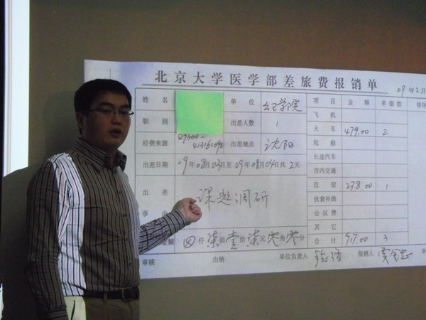 第一讲我们邀请到的主讲人是社医卫管研究生班的贾金忠同学,贾金忠同学今年读研三,在三年的学习生活中,练就了一手财务报销的绝活。他的讲座是按照财务报销中需要用到的各种票据来组织的,从普通借款、借支票、办理电汇、大额经费使用审批、还款、差旅报销等方面介绍了自己的心得体会和注意事项;当讲到某种具体的票据时候,他还配合着幻灯展示拍摄的实物照片,让大家理解的更加透彻。最后贾金忠同学把自己的报销心路归结为八个字,“细心、恒心、虚心、耐心”。