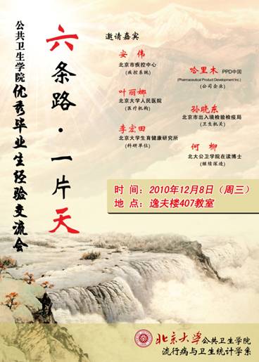 根据本系毕业生就业意向的统计,并结合本系研究生往届就业的去向,流行病与卫生统计学系团支部/班委会于12月8日晚7点在逸夫楼407教室举办主题为“六条路.一片天”的优秀毕业生经验交流会,邀请了6名在“医院”、“疾控事业单位”、“卫生机关单位”、“科研单位”、“公司企业”以及“继续深造”六个主要方向上小有成就的师兄师姐给大家传授经验。