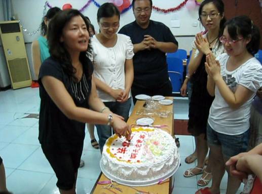 班主任张老师讲话后,与毕业生一起切蛋糕。