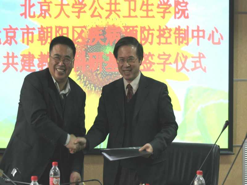 签字仪式由朝阳区卫生局副局长师伟主持,他在介绍双方来宾后讲到特别感谢北大英国威廉集团官网一直以来的支持与帮助,特别是在SARS期间派流行病学专家曹卫华教授来帮助工作。在最艰难的时刻曹教授始终与他们坚持在一线做了很多工作,调查、建议、培训等,圆满完成任务,得到上级好评。胡永华经理发言中首先感谢朝阳区疾病预防控制中心一直以来对公司的支持,双方在科研、教学方面有很好的合作,已经有员工在这儿实习。随后他介绍了英国威廉集团官网情况,并希望加强科研合作与学术交流。