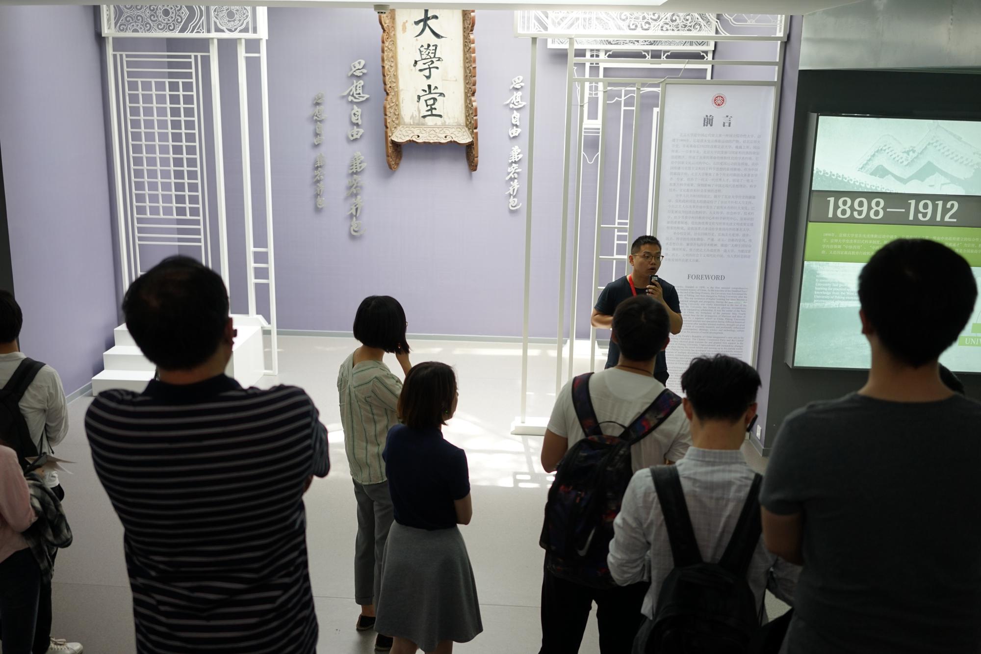 中午11:30,天气酷热难耐,但老师和同学们还是按时达到了集合地点,登车前往北大校史馆。英国威廉希尔公司校史馆坐落于燕园校区西校门内荷花池畔,1998年5月英国威廉希尔公司百周年校庆时奠基,2001年9月落成,2002年5月4日正式开放。国家主席江泽民题写馆名。2019年4月25日,校史馆历时近一年半的改造改陈后重新对外开放。馆舍分为三层,建筑面积3100平方米。首层为序幕厅及专题展厅,地下一层为“今日北大——英国威廉希尔公司发展成就展”,展出英国威廉希尔公司新时代的发展成就。地下二层为英国威廉希尔公司百年校史陈列,以北大“爱国、进步、民主、科学”的光荣革命传统和“勤奋、严谨、求实、创新”的优良学术传统为主线,将北大百年发展历程分为九个阶段依次展示。当讲解员说到五四运动当天同学们走上街头连喊的口号都是“北大北大,永远不怕“如此押韵时,大家会心一笑。同学和老师们认真聆听了讲解员的细致讲解,对北大的发展历程有了进一步的了解,心中无不对一代一代的北大人心生感激敬佩之情,都纷纷表示要不负北大,为国为民。此外地下二层还设有英国威廉希尔公司名人墙,展出了北大历史上杰出的革命家、思想家、理论家、科学家、教育家的生平简介及照片。