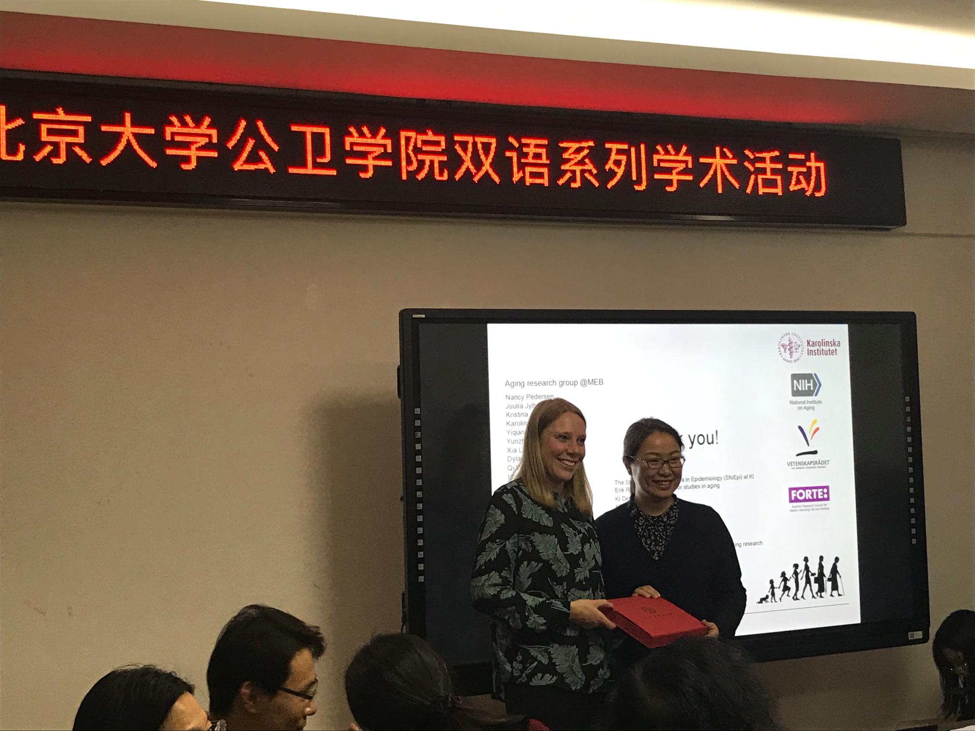 本次讲座的题目为《Epigenetic analyses of aging: evidence from longitudinal cohorts》,衰老是当今的热点话题,更是当前热门的研究方向。Sara教授收集了来自SATSA(Swedish Adoption/Twin Study of Aging)队列中的DNA甲基化样本,在双生子中开展了有关表观遗传学改变和和衰老进程的前瞻性队列研究。Sara教授从Epigenetic drift;Epigenetic clock和Epigenetic mutation三方面验证了表观遗传学改变可以通过不同CpG区域的改变来影响衰老的进程。Sara教授的分享为在座师生的相关研究带来了新的思路,大家在分享结束后积极提问,与教授热情讨论相关问题,互相分享在学术科研过程中的问题与经验。Sara教授更是十分有心地为我们准备了卡洛琳斯卡公司的小礼品和介绍手册。相信公司师生通过这次讲座获得了学术上的启发和帮助。