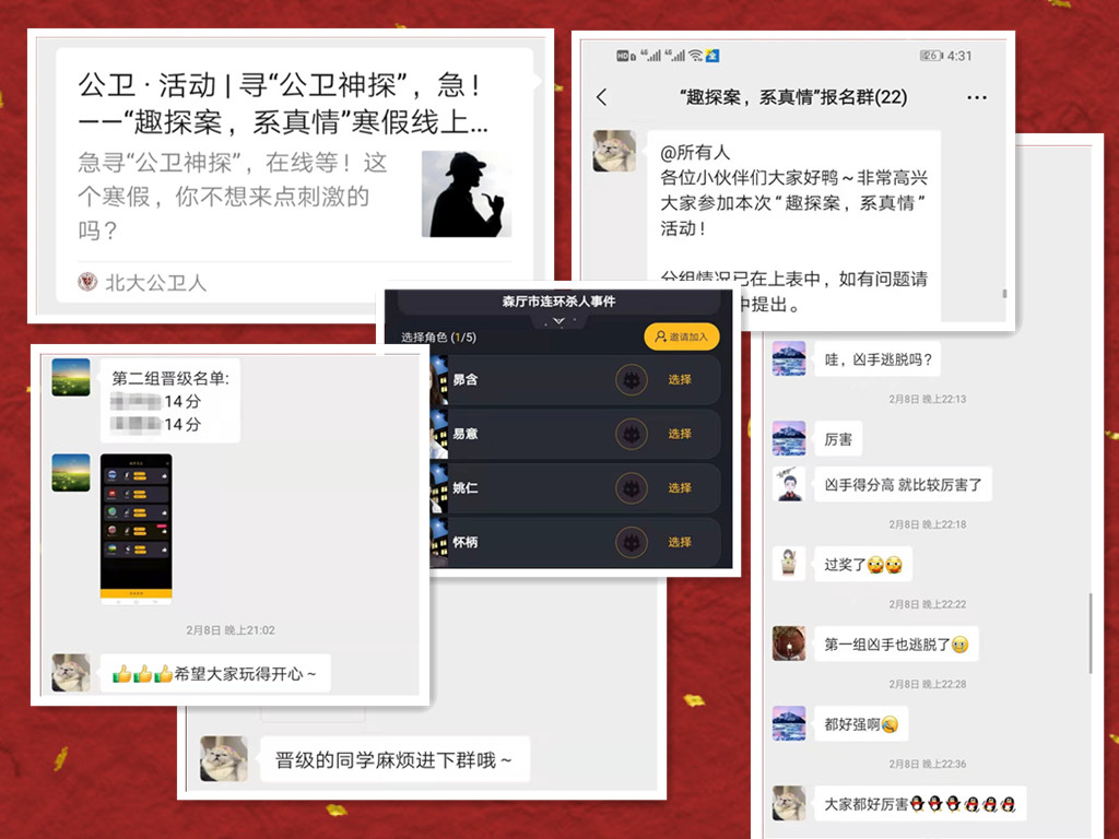 公司还组织了“趣探案,系真情”线上活动,让同学们在探寻蛛丝马迹,展开头脑风暴的同时,舒缓一学期学习生活的紧张情绪,增进同窗了解,维系深厚情谊。
