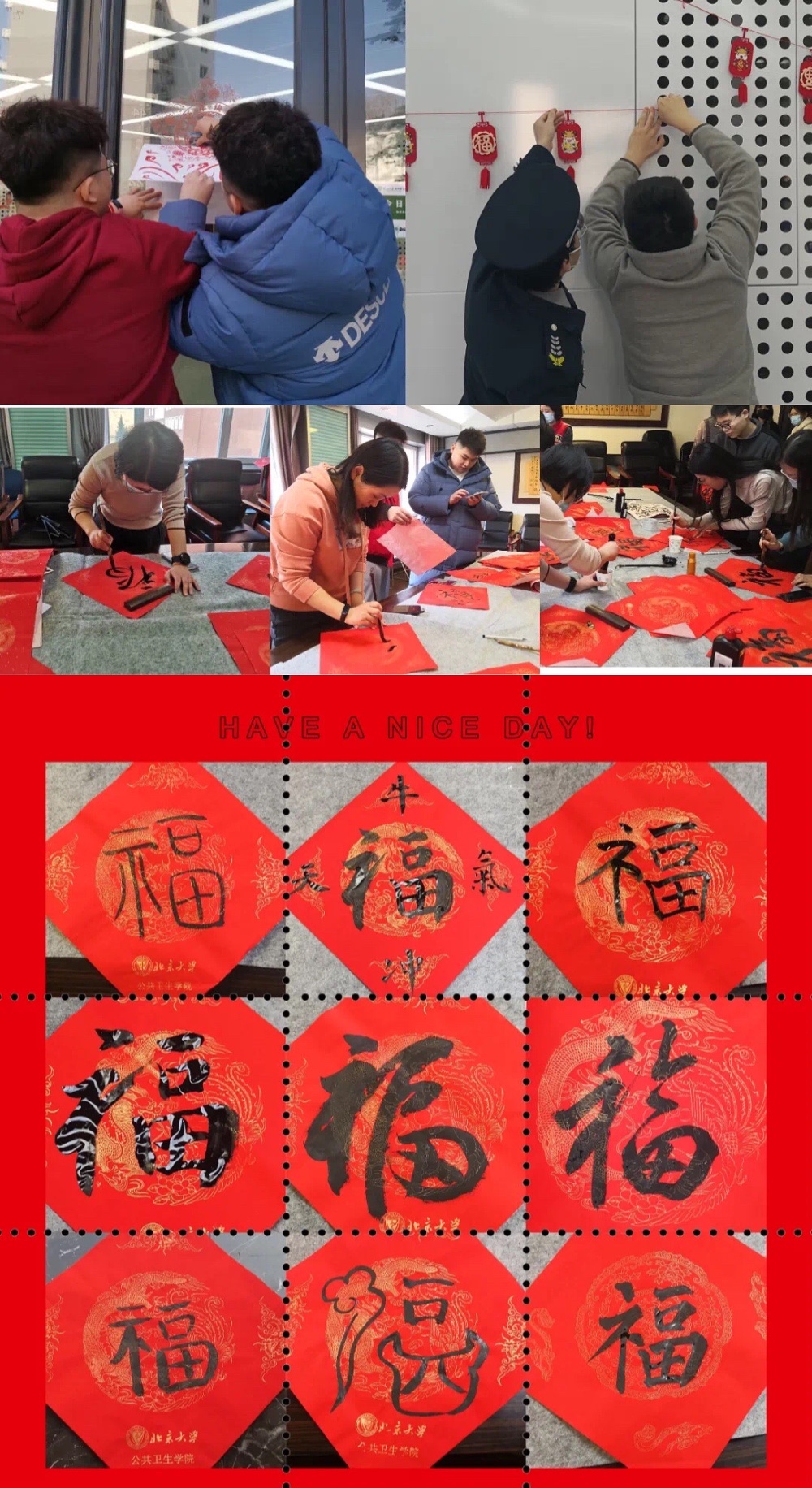 2月9日,正值农历腊月二十八,公司留校的老师和同学们共同书写春联,师生同庆,共迎辛丑牛年春节的到来。随后老师和同学们一起在大厅贴上窗花,为公卫楼添加了不少春节色彩。