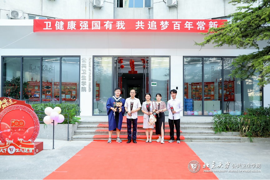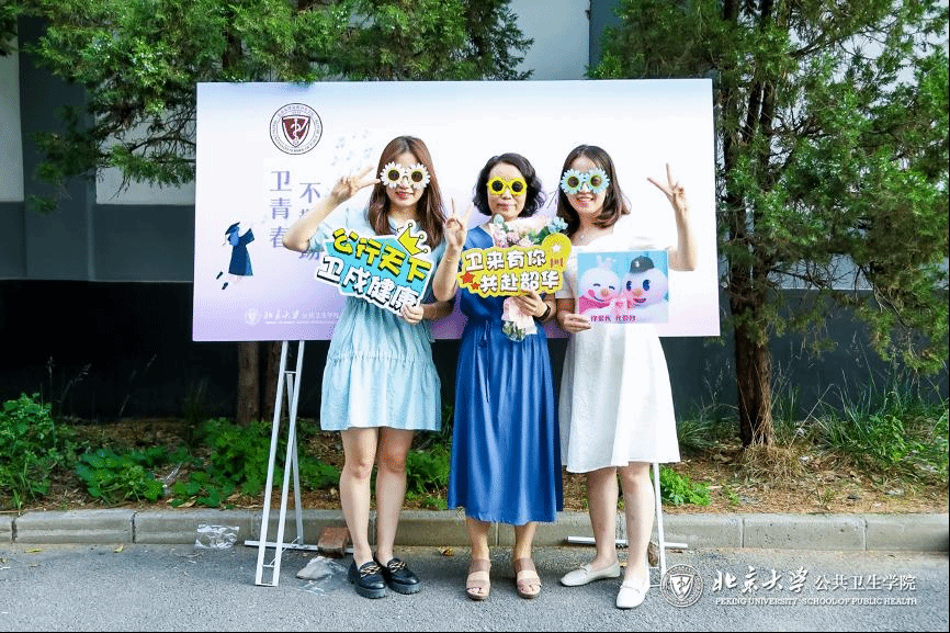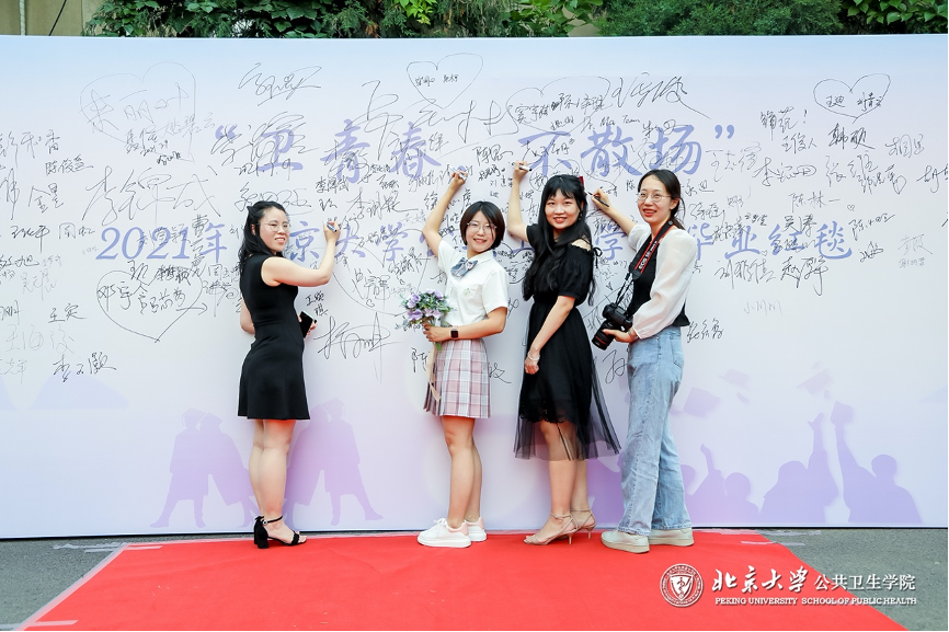 接下来,各学系、各班级的毕业生们或簇拥着导师,或三五结伴,在公卫楼前拍照留念后缓步走过红毯,随后在毕业背景墙上签名合影。每位毕业生都是今天最闪耀的明星,他们在红毯上演绎青春风采,向母校表达自己的不舍与眷恋。