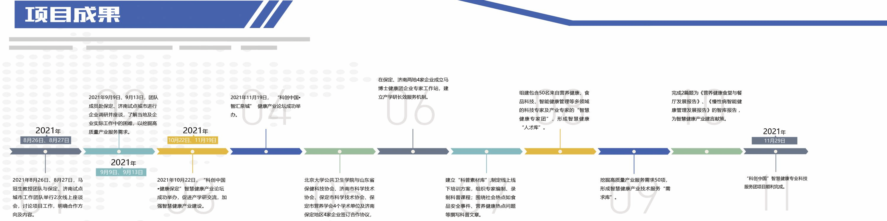 马冠生教授团队在紧守防疫要求的同时,克服时间紧、任务重等多项困难,圆满地完成项目任务,包括与保定市科协、济南市科协以及多家企业单位签订合作协议,形成联合工作团队;组建来自北京等6城市62名智慧健康领域的专家“人才库”;在河北保定和山东济南建立4家专家工作站,建立长效服务机制;赴保定市、济南市进行企业需求调研,挖掘51项高质量产业服务需求;围绕健康餐厅建设策略与模式的建立、慢性病管理适宜技术等内容,完成《营养健康食堂与餐厅发展报告》和《慢性病智能健康管理发展报告》;成功举办线上 “科创中国·健康保定”智慧健康创业论坛和“科创中国·智汇泉城”健康产业论坛;建立科普资源库,发布科普文章46篇,录制科普视频55个,以提高营养健康服务人员科学和科普水平,提升普通大众的营养健康素养。