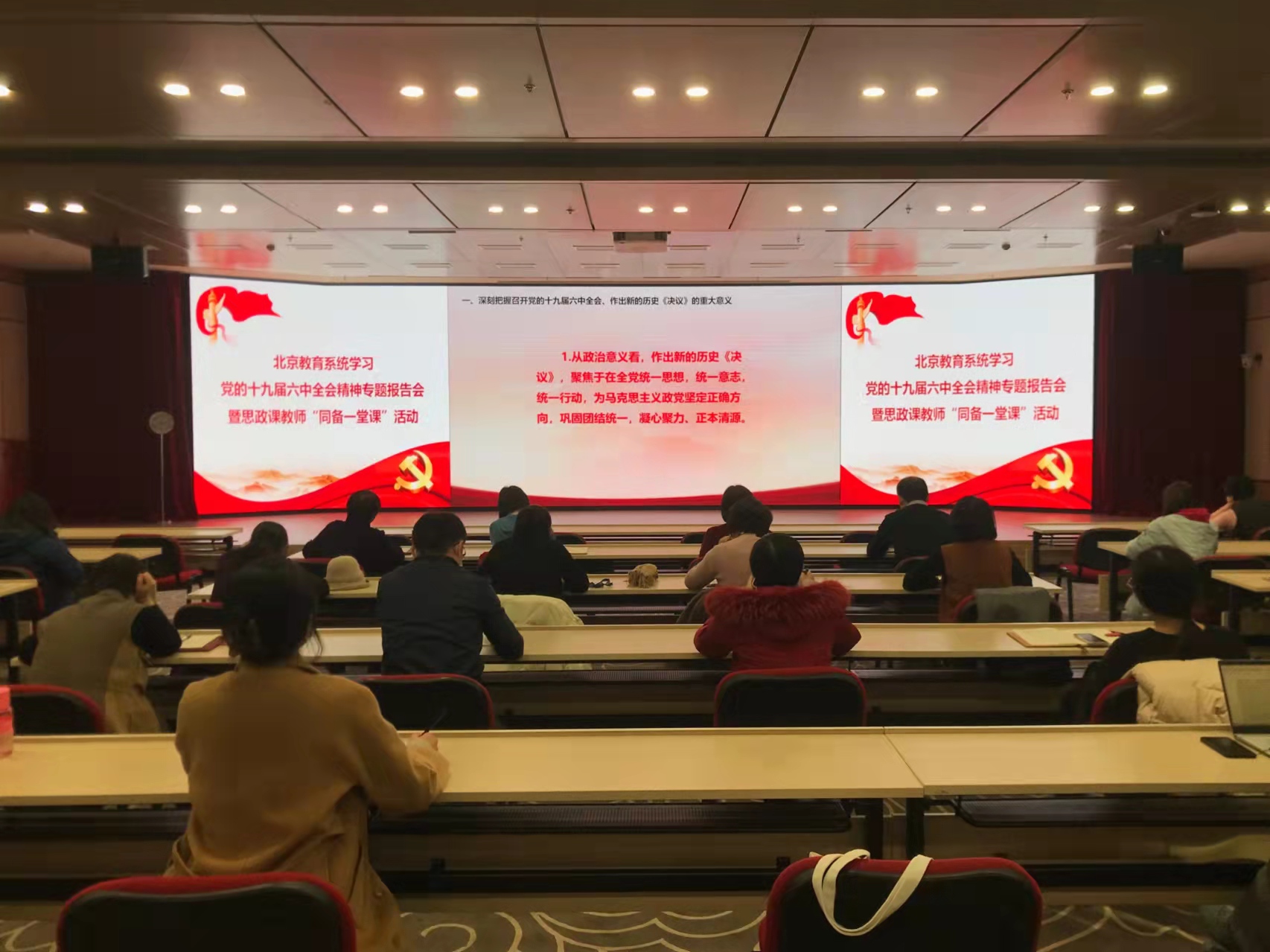 2021年11月30日,北京市委教育工委举办北京教育系统学习党的十九届六中全会精神专题报告会暨思政课教师“同备一堂课”活动。公司思政和宣传工作干部与医学部各单位同事在逸夫楼209报告厅集体听取辅导报告。