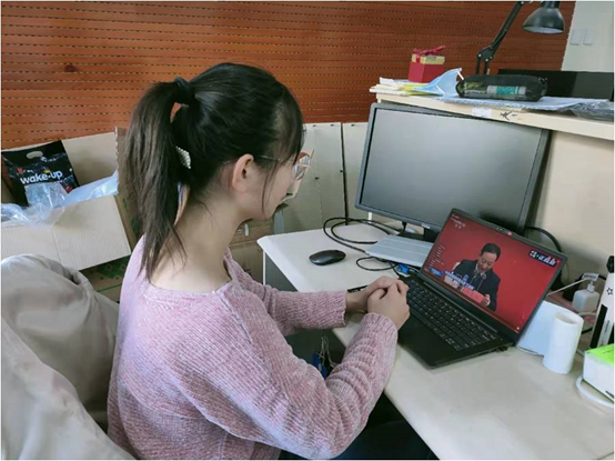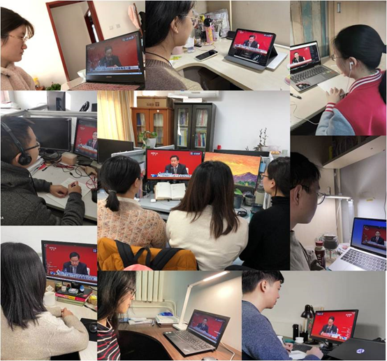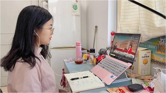 同样的场景,同时出现在员工自习室里、宿舍楼内。那些因疫情防控原因,无法聚到一处的同志们,不仅有正式党员,还有入党积极分子、共青团员和群众,他们都在自己在力所能及地利用自身条件“创造性”地收看。