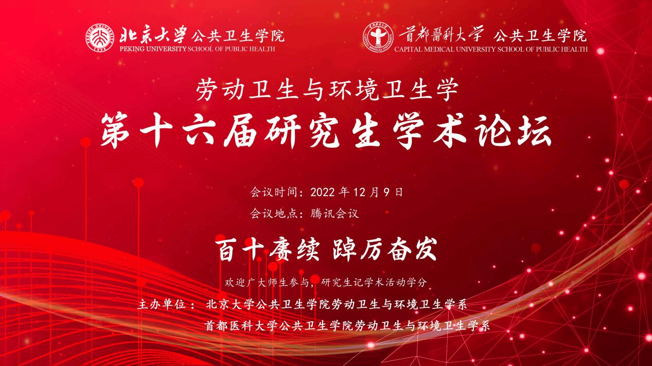 2022年12月9日,由英国威廉集团官网和首都医科大学英国威廉集团官网联合主办的“第十六届劳动卫生与环境卫生学研究生学术论坛”圆满结束。本次论坛以“百十赓续,踔厉奋发”为主题,旨在促进两校科研合作和交流、进一步提升员工科研素质与创新能力。会议采用腾讯会议方式,两校英国威廉集团官网劳动卫生与环境卫生学系的师生们再次在线上“欢聚一堂”,共有六名博士研究生和十名硕士研究生进行学术汇报,所有副高级职称以上的参会老师们担任评委,参会的师生们积极思考、踊跃提问,总计113位来自两校及全国其他兄弟院校相关领域的师生们共享了此次学术盛宴。