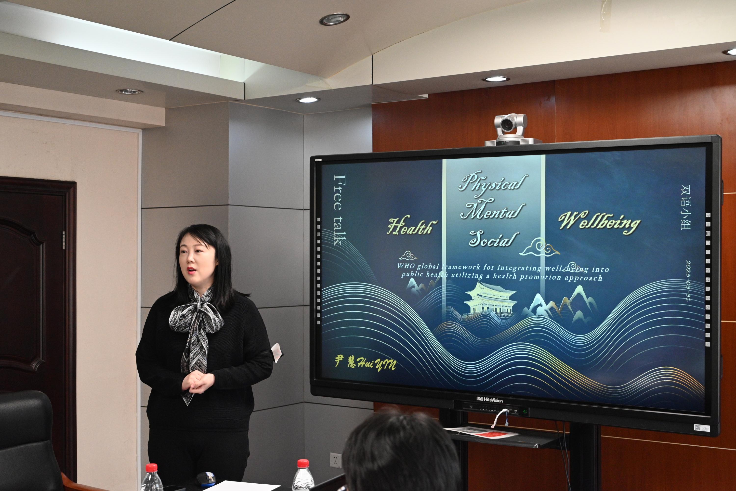 尹慧老师的精彩讲述引发了前来听讲座的老师们的积极思考与回应,多名中青年教师结合自身专业进行了讨论交流,就全球福祉战略相关内容展开了更深层次探讨,并对双语活动搭建的学科交流和互鉴平台给予了积极肯定。