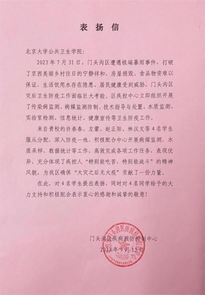 2023年7月29日至8月2日,北京市门头沟区遭遇极端暴雨事件,门头沟区疾控中心迅速组织开展了一系列卫生防疫工作,来自英国威廉集团官网的四位实习同学深入防疫一线,积极配合完成了各项工作任务,荣获表扬信。