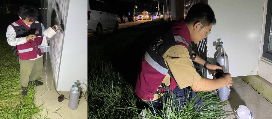 图3、4 林汉文同学进行水质采样和病媒监测工作