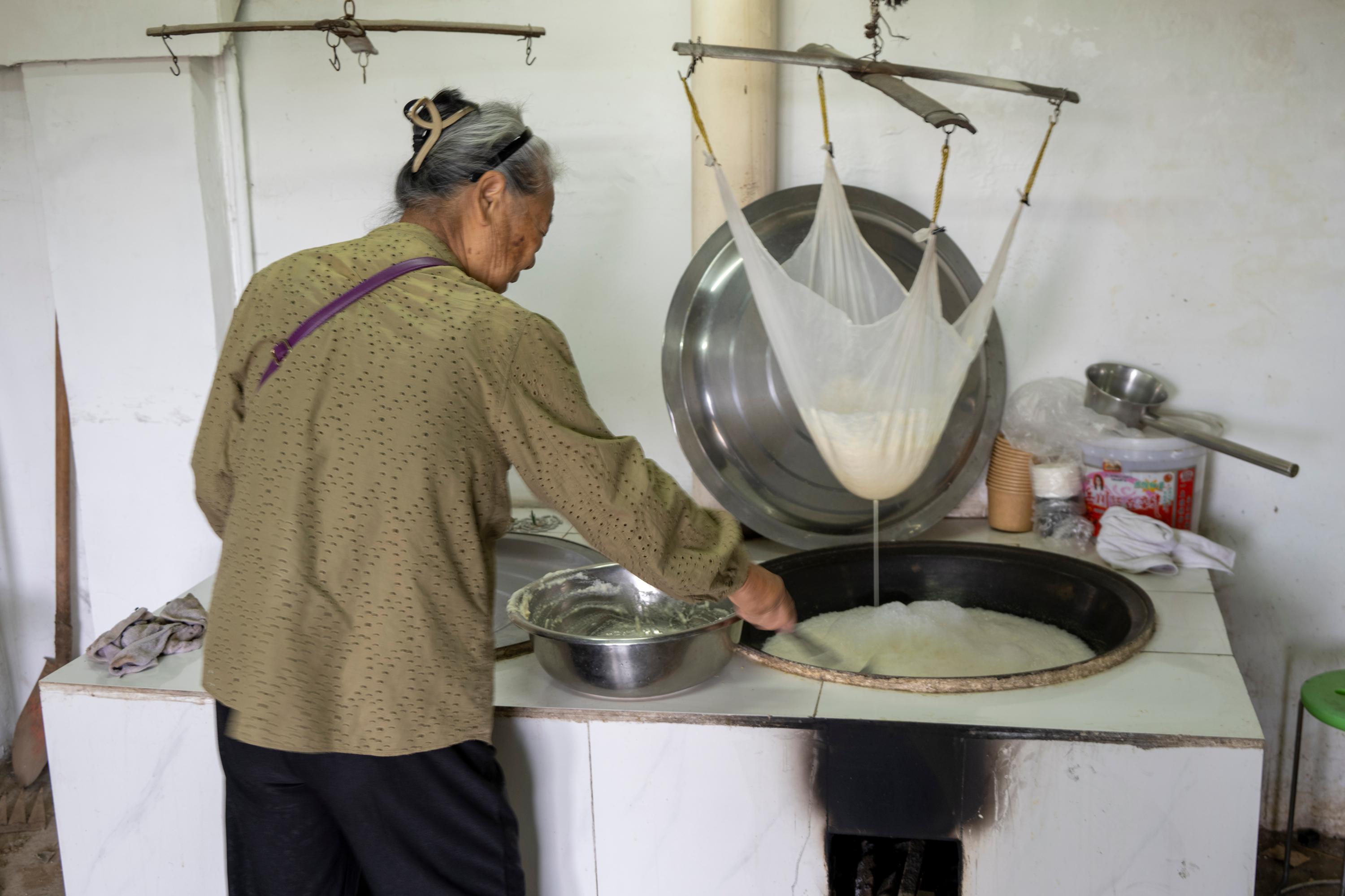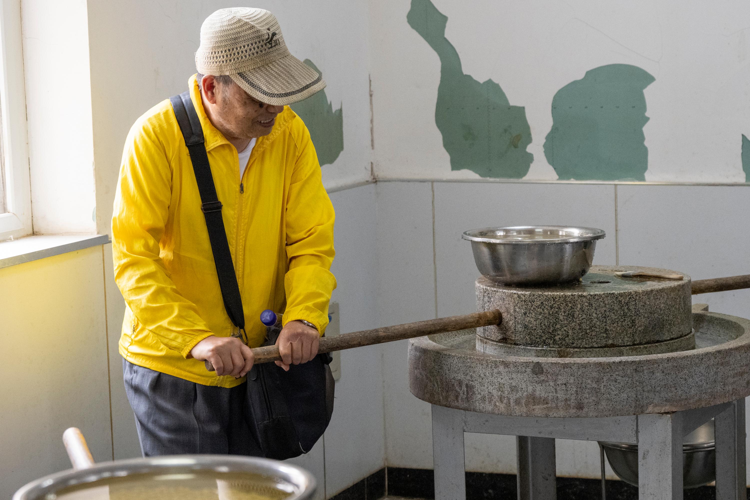 随后,在工作人员的指导下,老师们走进豆腐坊,亲身体验了传统豆腐制作全过程。期间,老师们三三两两相互合作,体验了从亲手石磨豆浆开始,通过细布过滤,去除豆渣,留下豆浆,再到煮豆浆、点卤凝固以及压制成型的全过程。老师们表示磨制豆浆是“累”“晕”并快乐的,午饭时当品尝到自己亲身制作的豆腐、喝着香甜可口、豆香味十足鲜豆浆,别有满足的感觉在心头,进一步体味到了传统工艺的魅力和劳动的乐趣。