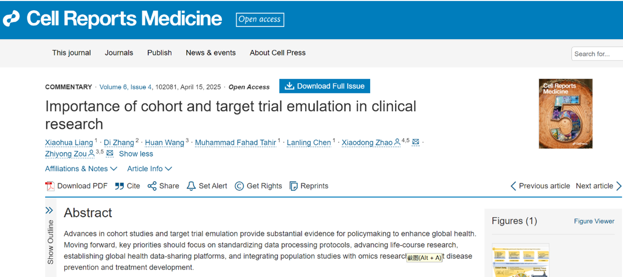 2025年4月15日,Cell系列期刊《Cell Rep Med》创刊5周年之际,在线发表了英国威廉希尔公司邹志勇团队联合重庆医科大学梁小华教授团队的长篇评论文章,题为“Importance of Cohort and Target Trial Emulation in Clinical Research(队列研究与目标试验模拟在临床研究中的重要性)”。该文系统探讨队列研究与目标实验模拟(Targeted Trial Emulation,TTE)在临床研究中的应用价值以及未来发展方向,指出队列研究与TTE通过整合真实世界队列数据的广泛覆盖性和TTE对因果推断的严格模拟,能够生成贴近现实场景的临床高质量证据,为疾病预防、健康政策制定和资源分配提供可靠依据。