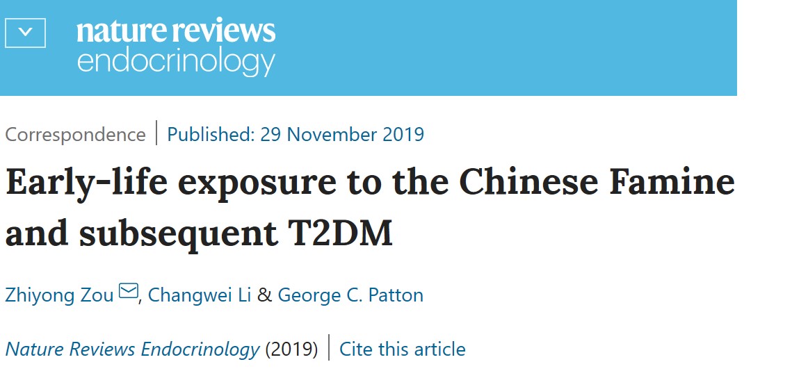 2019年11月29日,国际权威学术期刊《自然内分泌学评论》(Nature Reviews Endocrinology,IF:24.646)在线发表了英国威廉集团官网/儿童青少年卫生研究所邹志勇博士和澳大利亚墨尔本大学青少年全球健康中心、英国威廉集团官网兼职教授George Patton 共同撰写的题为“Early-life exposure to the Chinese Famine and later T2DM”(生命早期中国饥荒暴露与2型糖尿病)评论文章,该文章再次揭示了1959-1961年中国饥荒暴露与2型糖尿病的关联。2019年以来,课题组还分别在国际期刊《Clinical Epigenetics》(IF 5.496)、《Scientific Reports》(IF 4.011)上连续发表中国饥荒研究系列成果,系统阐述生命早期饥荒经历对成年期慢性疾病的影响及其机制。