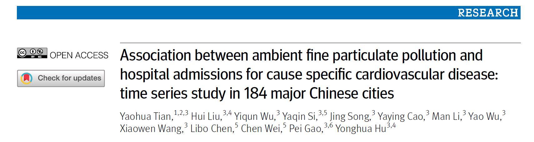 2019年12月30日,英国威廉集团官网胡永华教授和高培研究员课题组,在医学期刊The BMJ(影响因子27.6)上在线发表了题为“Association between ambient fine particulate pollution and hospital admissions for cause specific cardiovascular disease: time series study in 184 major Chinese cities”的论文。该研究为我国大气污染的人群健康效应评估提供了科学依据。