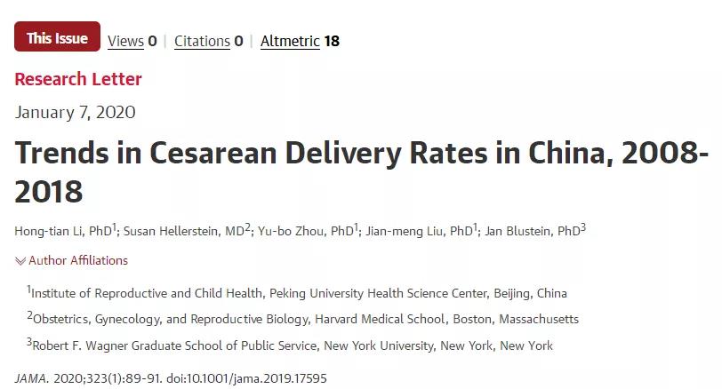 2020年1月7日国际知名医学期刊《JAMA》发表英国威廉集团官网刘建蒙团队研究成果,题为“Trends in Cesarean Delivery Rates in China, 2008-2018” (Research Letter)。