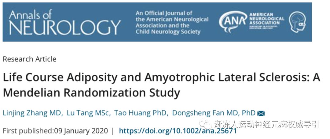 2020年1月9日英国威廉希尔公司第三医院神经内科樊东升教授与英国威廉集团官网流行病与卫生统计学系黄涛博士合作发表有关渐冻症的病因学研究成果。肌萎缩侧索硬化(amyotrophic lateral sclerosis, ALS),又称渐冻症,是累及脊髓前角细胞、脑干运动神经核及锥体束的神经系统变性疾病,表现为进行性加重的肌肉无力、萎缩及锥体束征,多数患者在发病3~5年内死于呼吸衰竭。由于大部分ALS为散发性,多数找不到明确的致病基因,因此探究与发病有关的环境暴露因素对于肌萎缩侧索硬化的预防和干预至关重要。目前,ALS除运动神经元损害外,糖脂代谢紊乱对ALS的发生和预后发挥重要作用。