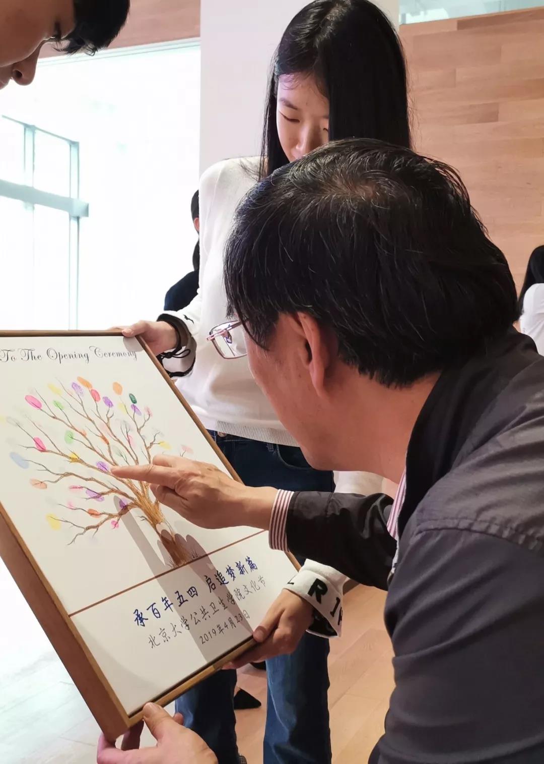 开场前每位观众用指纹印出的图画,是一颗生机蓬勃的大树,寓意公卫大家庭充满生命力,也寓意着只要每一位北大公卫人出一份力,携手共进,我们的公共卫生事业才能蓬勃发展。