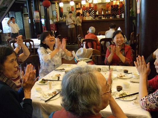 参观完毕,组织人员又带领老干部们到明慧茶院品茶、聊天,大家彼此交流退休后的生活乐趣。午饭期间,老干部们一时兴起,自发表演起节目。有唱歌的、有吹笛子的,给现场增添了无尽的欢笑,大家脸上都暂放了灿烂的笑容。
