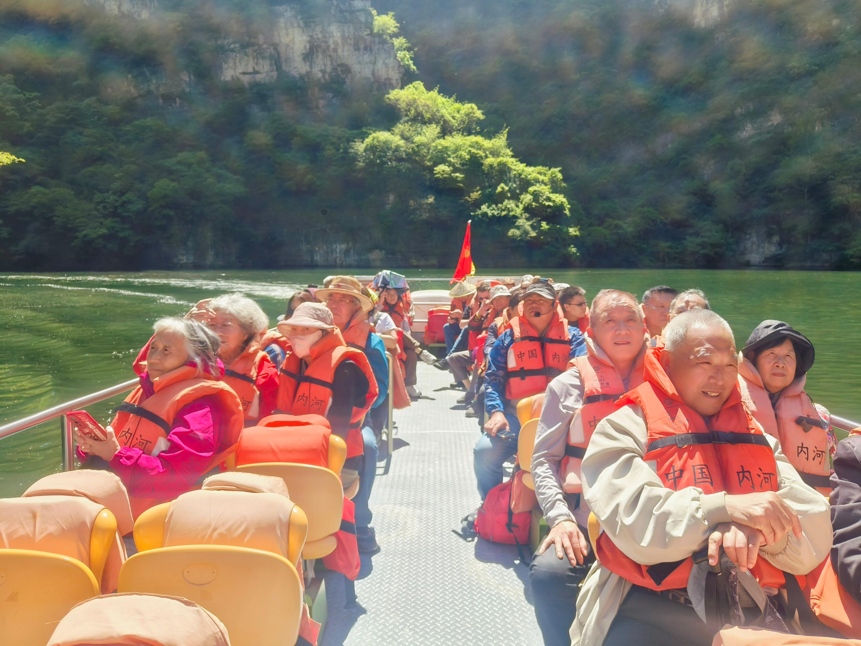 老师们纷纷举起手机记录下波光粼粼的水面:“这水多清啊,总说‘绿水青山就是金山银山’,今天算是亲眼见着了!”船行途中,老同志们或凭栏远眺,或围坐闲聊,清风拂过银发,笑声漾满船舷。