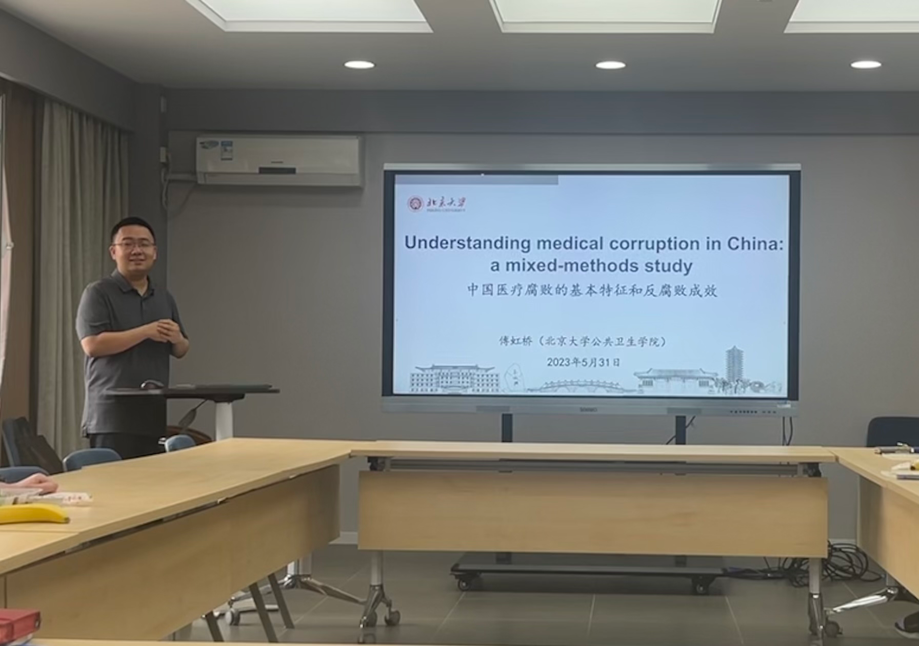 傅虹桥老师在报告中分享了对我国医疗卫生领域腐败特征、“反腐败”干预措施及其有效性等方面的研究心得,认为医疗卫生领域腐败严重影响广大人民群众的获得感和幸福感,对医疗系统会产生不良影响,应引起重视并开展深入的研究。报告中傅老师首先介绍了2012年以来我国政府开展的一系列打击医疗腐败干预举措;随后,傅老师以其最近发表在Health Policy Plan上文章为例,系统从驱动力量、关键角色、腐败行为、影响等方面分析了中国的医疗腐败现状,通过结合中国裁判文书网(CJO)提取的医疗腐败案件数据和中国健康与养老追踪调查(CHARLS)数据分析了我国医疗腐败的类型,并通过深度访谈分析了医疗腐败中的受贿、贪污和欺诈骗保的驱动因素以及对医疗系统的影响;最后,傅老师基于自己的研究成果,对新形势下如何抑制医疗腐败工作提出了政策建议。