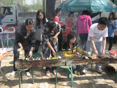 2012年4月14日早上,健康系同学一行16人踏着春天的气息来到了上庄水库,同学们兴高采烈地准备起烧烤用具,有的搬桌子,有的领食物,有的打扫着我们的一小片领地。终于炉子里的黑炭燃烧了起来,映红了同学们的脸。我们迫不及待地摆上一根根肉串,抹上金黄色的油,一边涂着各种佐料,一边有说有笑,阵阵欢声笑语和忙碌的身影中映示着我们的快乐与美好,不大一会,香味就充斥在整个场地,同学们拿着自己的杰作得意的炫耀着、攀比着,还有的同学把烤好的鸡翅拿给给师兄、师姐,即使有时那鸡翅焦如黑炭,我们也吃得津津乐道。