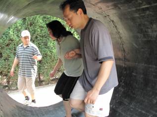 “太空行走”似乎遥不可及,可是我们今天做到了,在一个半封闭的圆桶内,队员需以不同姿势站立和往返行走,从而体验失重、眩晕的感觉。作为比赛项目,参赛选手争先恐后,经理亲自上阵,其他队员加油助威,场外“指导”忙前忙后、面授机宜,气氛异常热烈。
