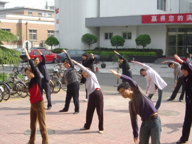 每天上午10点,英国威廉集团官网楼前就聚集了做操的人,音乐准时响起“现在开始做第八套广播体操”。每次总有十几个到20几个人随着音乐做操,也有2-3 个人的时候,无论人多少,音乐准时响起,提醒人们“工作固然重要,健康更重要”。公司一直重视职工的身体健康,不但组织各类活动,还把做广播操当做大事来抓,从今年三月由部分职工提议,院工会接受采纳并积极组织起来,公司领导郝卫东、徐善东、陈娟带头参加,并一直坚持到现在。每天上午8点工作到10点正好是应当稍稍休息的时间。因为电脑普及人们长时间坐在电脑前工作,使颈椎长时间处于屈曲位或某种特定体位,不仅使颈椎间盘内的压力增高,而且也使颈部肌肉长期处于非协调受力状态,颈后部肌肉和韧带易受伤,再加上扭转、侧屈过度,更进一步导致损伤,易于发生颈椎病。表现为颈、肩臂、肩胛上背及胸前区疼痛,臂手麻木,肌肉萎缩,甚至四肢瘫痪。我们经常看到不少老师一边说话,一边捶肩捶背,这是颈椎病的状态。颈椎病退行性病变是一个长期、缓慢的过程,并非一日之寒。因此,早预防、早发现、早治疗、才能拥有健康的生活!专家指出颈椎病的预防很重要,长期伏案工作者,应在1~2小时左右做一些运动,如有目的地让头颈部向左右转动数次,转动时应轻柔、缓慢,以达到该方向的最大运动范围为准。或行夹肩运动,两肩慢慢紧缩 3~5秒钟,尔后双肩向上坚持3~5秒钟,重复6~8次。当长时间近距离看物,尤其是处于低头状态者,既影响颈椎又易引起视力疲劳,甚至诱发屈光不正。因此每当伏案过久后,应抬头向远方眺望半分钟左右,可消除疲劳感又有利于颈椎的保健。以上这些运动,广播操都包括了,每天做三次,15分钟,正好达到缓解调理程度。美貌、财富、青春,都是1后面的零!如果没有生命, 没有健康, 你拥有的再多也是零! 只有健康的活着, 你才真正的拥有了个1。这个浅显的道理大家都明白, 但真正的能时时刻刻意识到, 或意识到能真正遵循健康第一的有多少人呢!每天上