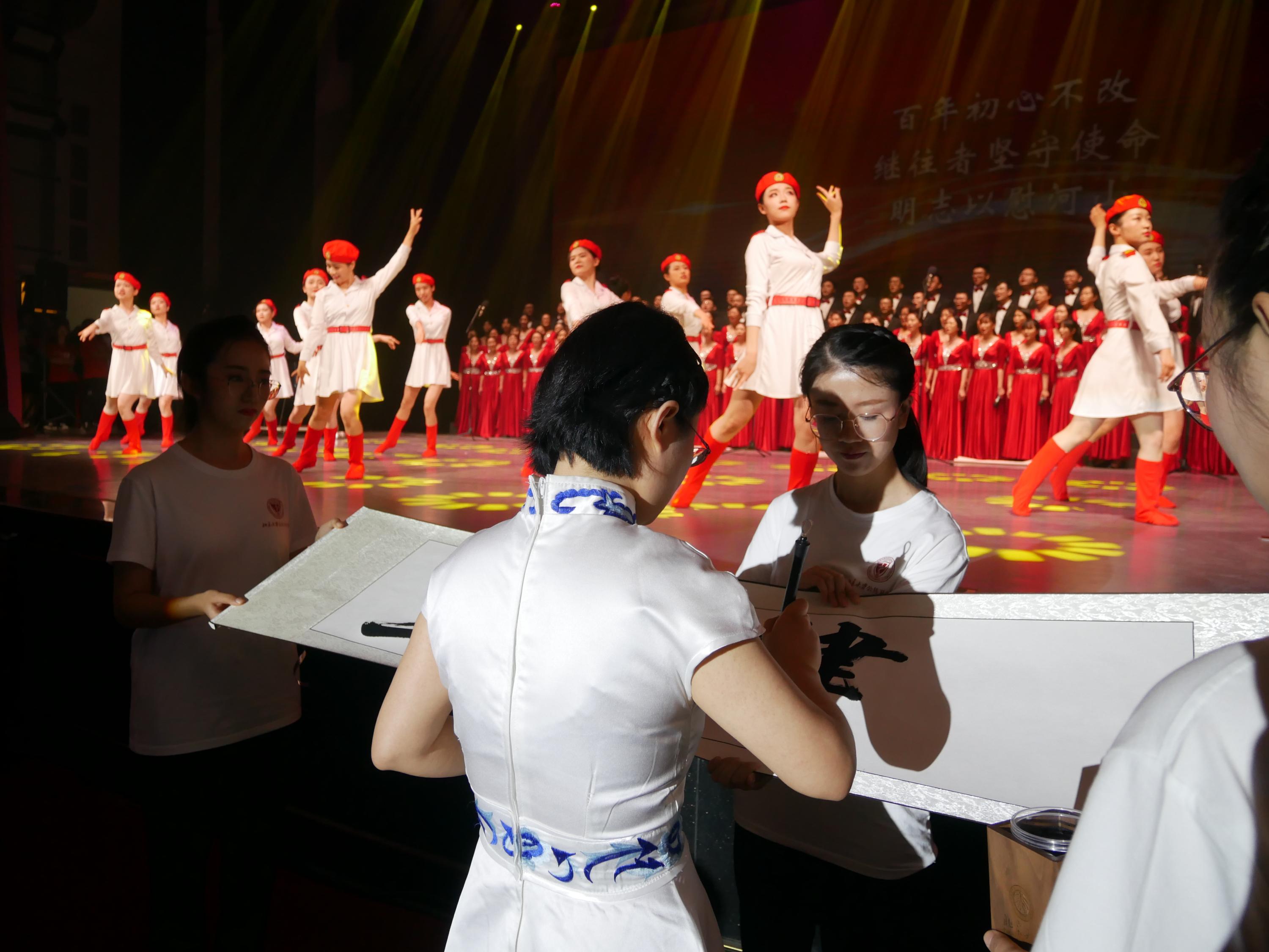演出中,有一组不可或缺的群体——书法组。主笔人劳动卫生与环境卫生学系黄婧老师和陈子砚同学,与书法组8位同学一道,默契配合,从托墨到展示横幅,从卷轴尺寸到笔墨浓淡的调整,反复试验,精于练习。最终,在两幅长达四米的横幅上,分别书写“公行天下”、“卫戍健康”,八个大字,为党庆生;用书法书写公卫人把青春与梦想融入公共卫生事业的豪迈激情!表达对伟大的中国共产党炽烈的爱,为伟大的中国共产党庆生的激动之情!