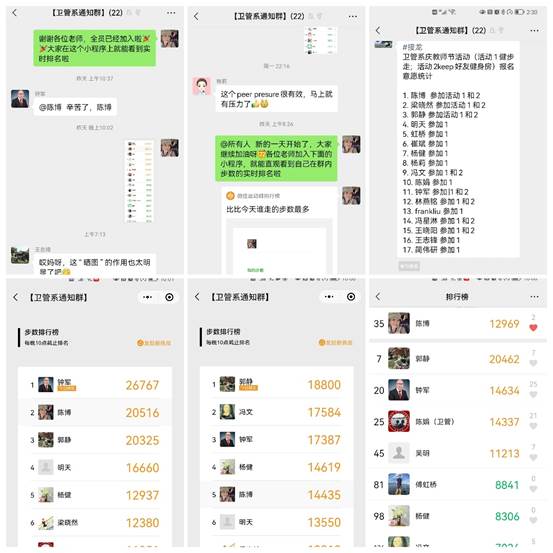 健步走活动于9月9日在卫管系微信群里发起报名,卫管系17名老师报名,参与率100%。活动于9月12日正式开始,每晚10点党政工小组长将本日步数排名截图发至群内,多次引发老师们在群内的调侃,充分调动起老师们比拼的积极性和对锻炼的关注度。系内17位老师9月12-14日的日均步数分别为7901步、10458步、9452步,基本上实现了活动设计的效果。
