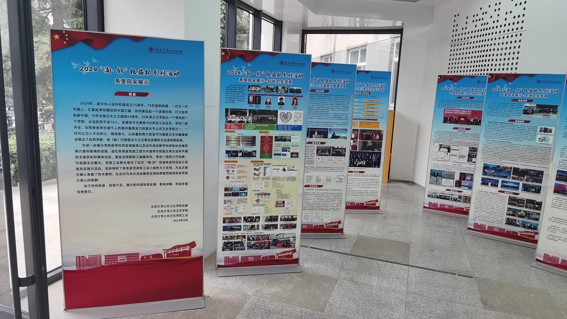 在庆祝中华人民共和国成立75周年、喜迎第40个教师节来临之际,为充分展示公共卫生公司各系(所、中心)的建设成绩及活动风采,2024年8月28日,在2024年秋季新学期第一天,公司工会“淘·好”权益杯系列活动之“集乐淘 共创好”系室风采展示在新公卫楼一层阳光大厅开幕。