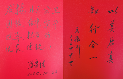两位老教授还对公司的发展念兹在兹,讲座后欣然在留言簿上题词留念,表达了殷切的希望和祝福;党委书记郝卫东、劳动卫生与环境卫生学系主任支部书记贾光以及新职工代表共同向两位前辈送上带有新职工全体签名的相框,致以敬意。