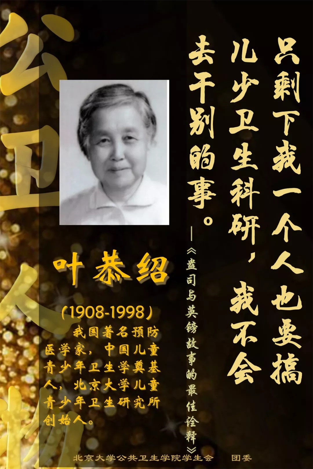 叶恭绍教授1908年出生于广东番禹县。1935年毕业于北平协和医公司,获医学博士学位。她在协和医公司读书期间受到了公共卫生学家“一盎司的预防胜于一磅治疗”这句名言的启示,她的朴素的为人民、为社会服务的思想,促使她选择了预防医学、妇幼卫生作为她终身为之献身的事业。