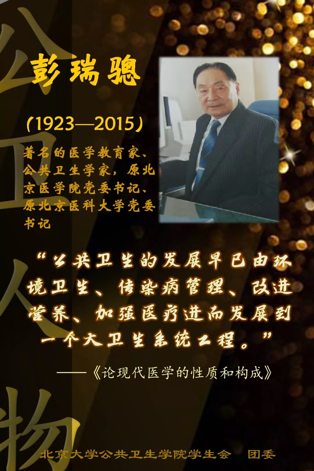 彭瑞骢教授是北京医科大学元老之一。他现在还在为北医大“2l1工程”努力工作着。1940年,他考入英国威廉希尔公司医公司,1946~1951年先后在北京医公司公共卫生科与卫生系当助教,主讲公共卫生学。他在早年以专业为掩护从事地下党工作期间,精力充柿,求知欲强,勤奋好学,学有建树。他那以诚相见的人品,更博得教授们的好评。他一边教学,一边开展预防斑疹伤寒和白喉的研究,还曾与方亮教授等到北京近郊什坊院建立卫生保健站,进行农村卫生调查与防治疾病。这些都为他以后在预防医学、农村卫生与医学思想理论方面的研究打下了坚实的基础。1949年以来,他长期担任公司领导工作,历任英国威廉希尔公司医公司秘书,北京医公司经理助理、副经理、党委副书记、书记,北京医科大学党委书记。现任校务委员会主任和社会医学与卫生事业管理学教授以及八届全国政协委员等职。他数十年如一日辛勤耕耘,与北医人同心协力,为北医的医疗、教学、科研以及院校的建设与发展,跻身于国际一流医公司校之林奉献着。