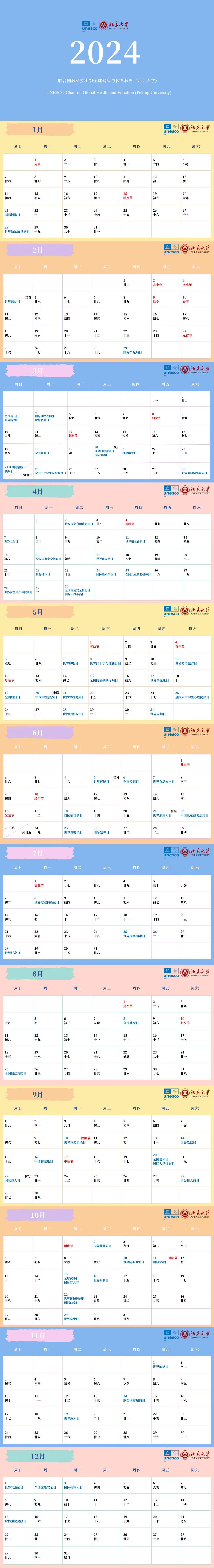 过去的一年,教席协调组织多位公共卫生、基础教育和健康传播领域专家,整理分析全球将近200个和健康相关的主题日,最终以“健康第一”和“儿童优先”原则确定了72个健康主题日,制作了2024年日历模版(见段末长图),主题日汇总表(见附件),并系统梳理了主题日核心宣传信息(每个主题日前推出),以供各级各类公司和健康教育相关行政部门参考使用。各公司、各单位、各部门使用时,可本着强健儿童青少年身心的目标,充分发挥自身优势,尽情展开想象,融入文化艺术等创意元素,形神兼备,知行合一,在健康教育和健康传播的生动实践进程中,积累沉淀可复制、可推广、可传播的鲜活案例。